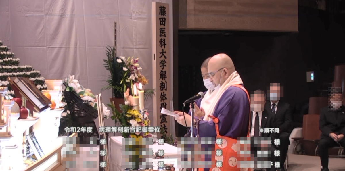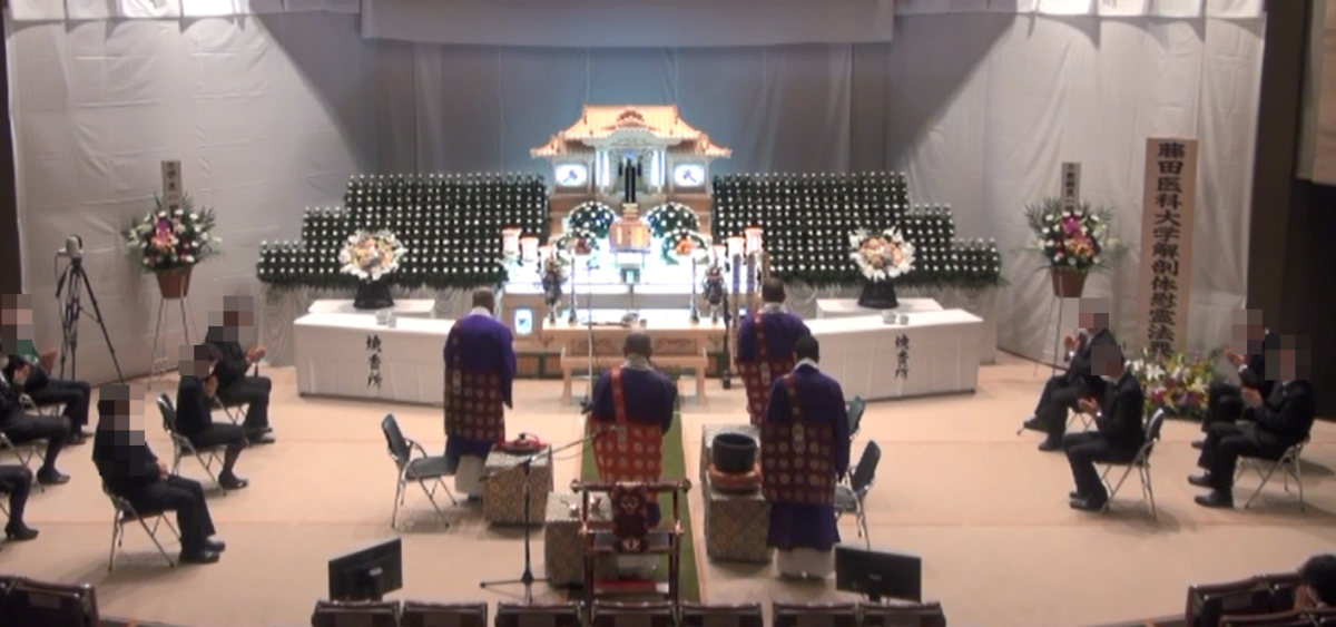 藤田医科大学医学部開学後10年も過ぎた頃、医学部教育で一度だけ履修をすればよい解剖実習を3度も行っていた。創立者の思いは確か、2年生の前期と後期に二度、6年生にもう一度の解剖実習を命じ教職員学生は奔走し、学生は24時間学校に居るくらいの勉強を強いられていた。「黙とうに始まり黙とうに終わる」「人脂に染まった解剖のノート」「実習が終わっても勉強は終わらない、終わったら次の実習」と本当に6年間で三度も解剖実習をさせて頂いた大学は多分、藤田医科大学だけであったでしょう。他に類例のないカリキュラムであったと思います。門外漢の私がこの事を知っているのは医学部教学局の方々がご遺体を丁重に納棺され高徳院で読経を実施されその大変さを肌で私は感じていた。「艱難辛苦汝を玉にする」 藤田医科大学も大きな講堂が出来上がり供養祭は場所を移し、現在も丁寧な読経供養が毎年なされており本日もコロナ下環境の中、配慮の行き届いた中で読経がなされた。