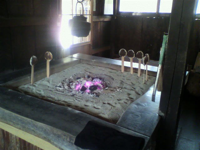 外は雨も降り出し、凄い勢いで地面に叩きつけている様子である。「雨が降り出したから、お婆ちゃんまたね」と逃げ出すように五平餅屋さんから這い出してお寺に帰ってきました。まさか、郡上のあんな田舎で私のお寺を知ってくれている方が2人もいるとは思いませんでした。この度の高山思いつきツアーは亡父に出会い、五平餅屋さんで親しくお話しをして貰って、大変うれしい清々しい気持ちとチョッピリ、センチメンタルな思いの初秋温泉旅行でした。写真は五平餅屋さんの気長な五平餅焼のいろり。「お婆ちゃん、餅の中、生温いよ」って言ったら「朝から焼いとったら真っ黒焦げになっちゃうでよ」だって。生温い五平餅ですがとても美味しいかったです。「もう一本食わんか?」って勧められましたがお腹一杯になりました。