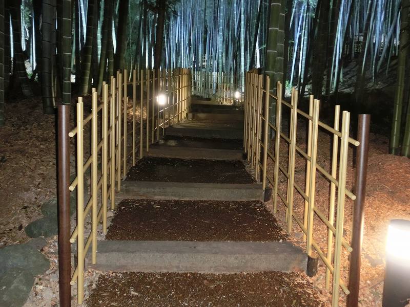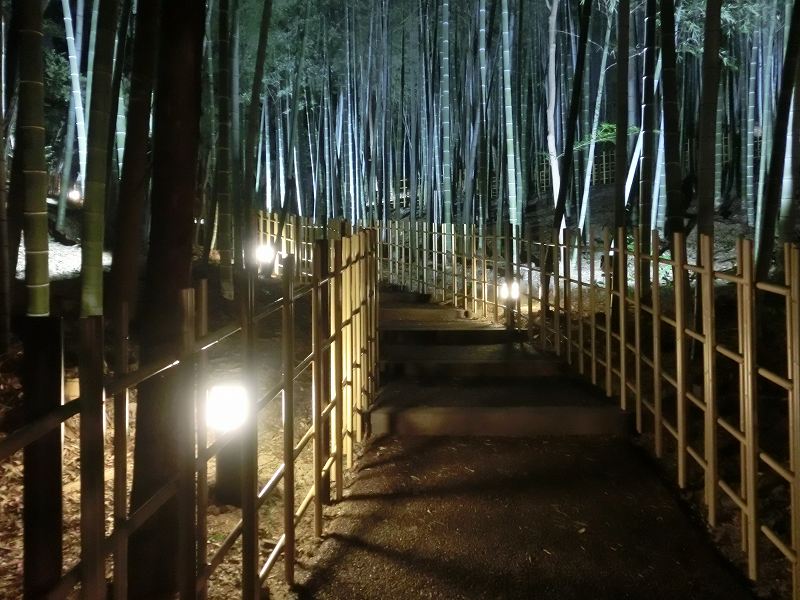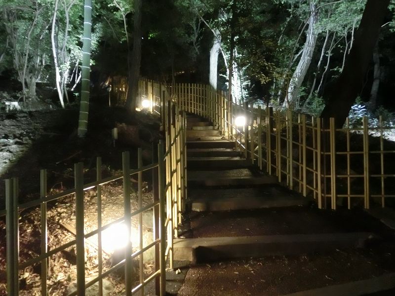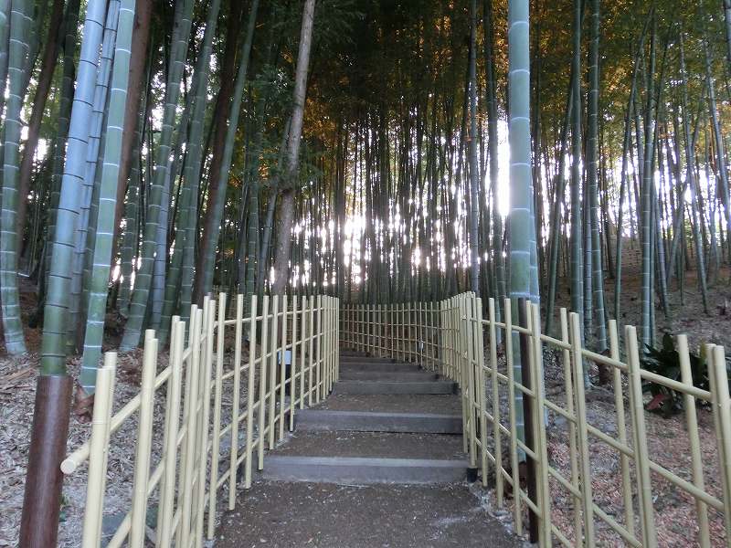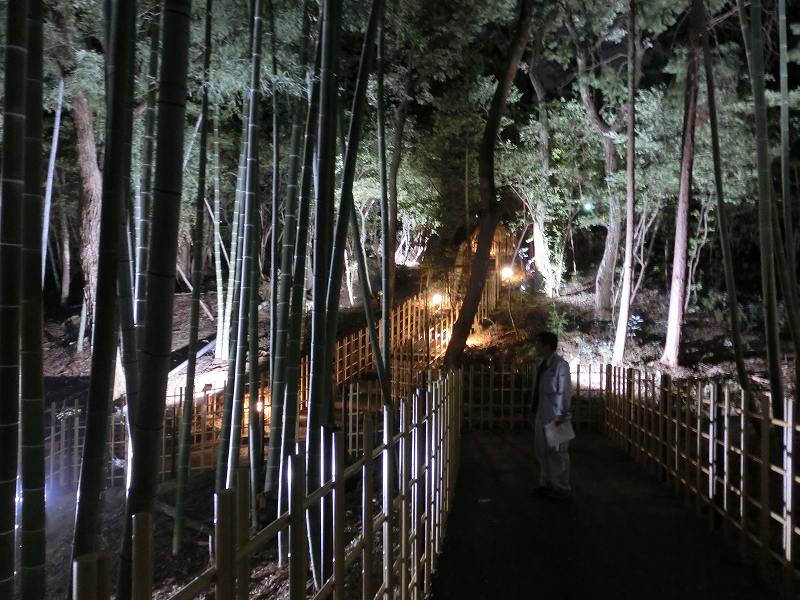 夕焼けの瑜祇塔 日没前の竹林入口 静かに散策してゆっくりと森林浴を楽しんで欲しいのです 竹林入口 本堂の脇です 照明はLED 50Wの消費で4倍の光量があるとの事 試験照明です 照明はお寺の行事に 如何ですか? ロマンティックでしょ!? ロマンティックには 大変な設備費とこれからは維持費が待っています