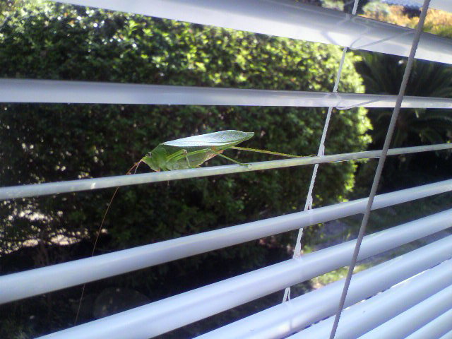 今日、廊下を歩いていたらブラインドにバッタ?がとまっていました。白のブラインドに緑のバッタ。昔は沢山いたのですが今は草むらも少なくなったので珍しい姿になりました。のんびりと陽にあたるバッタくんです。