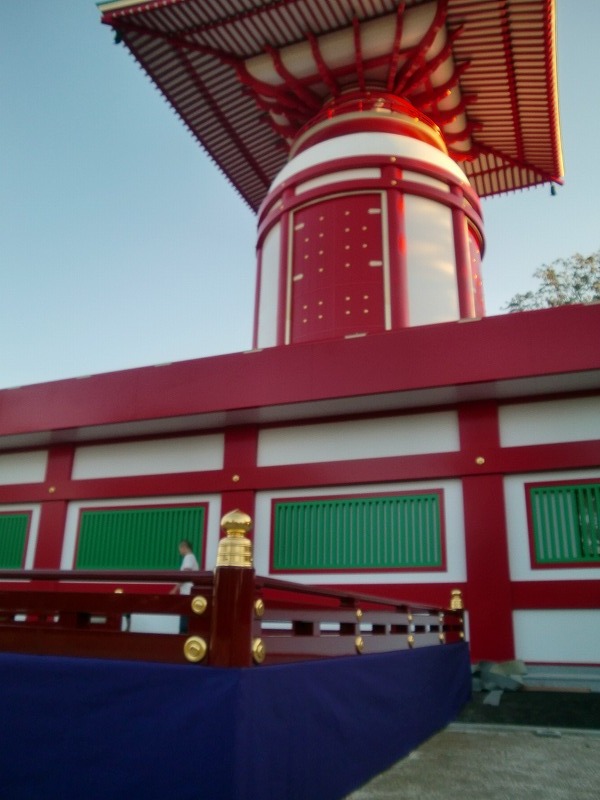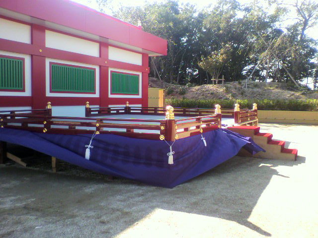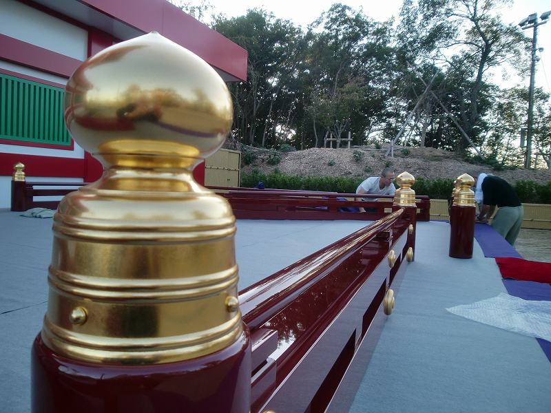 和歌山から自動車でお寺へ向かう途中、最初で最後の法要会場を再現して、今夜行われる予定のお経の練習に間に合わせようと急に思い立ちお寺へ電話をして舞台の設営をするようにお願いをしまして。午後6時よりお経の練習に私も参加して初めて舞台の上に載り、新たに作られた欄干の雰囲気を、ため息と共に味わいました。組み立てから夜の練習をアップしますのでご覧下さい。明日には屋内式典会場へ撤収して瑜祇塔横での設営は本当に最後となります。私の夢でしたが天気にはかないませんでした。
