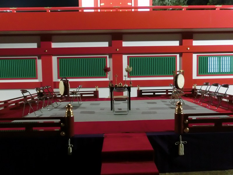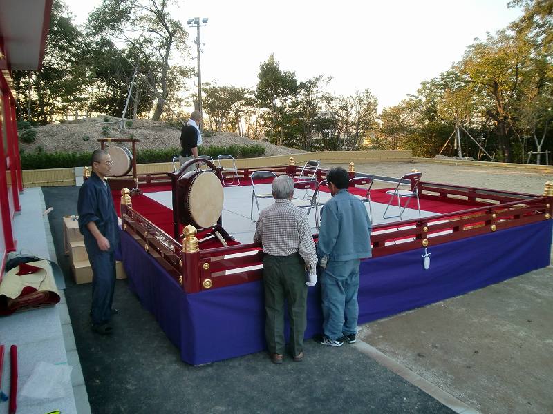 今日は京都の仏具屋さんがお越しになられて瑜祇塔舞台に設置する欄干を持ってきて頂きました。収納に便利で見栄えも良い物と私の勝手な希望を全て聞き入れて下さって大変立派なお品の納入が出来ました。私が二言目に「無風の晴にしたい」とポロリと何度も何度もこぼす。雨の日には雲上愛昇殿ホールにて式典を行うよう、全ての対応を雨バージョンにシフト変更を致しました。ただ、最初の最後になるかも知れない瑜祇塔前での式典舞台を少し再現しました。ご覧下さい。何だか私のため息が聞こえるでしょうかね?