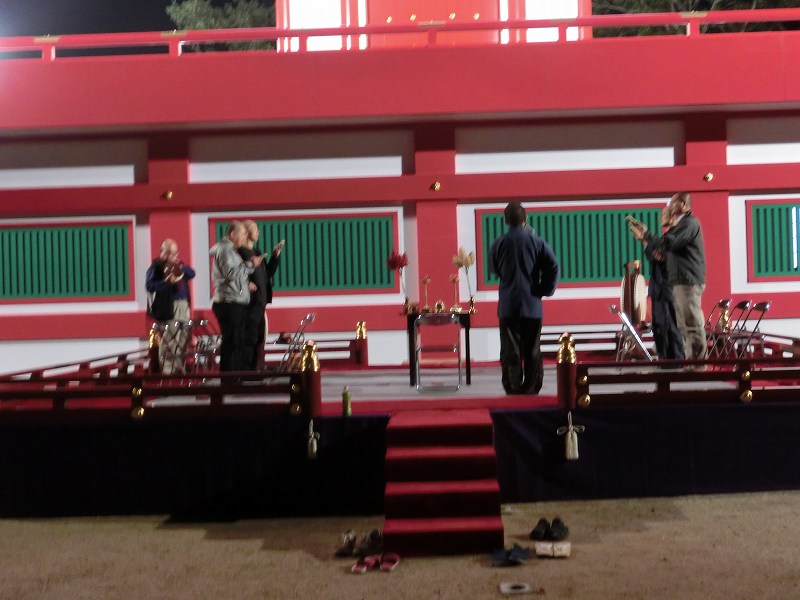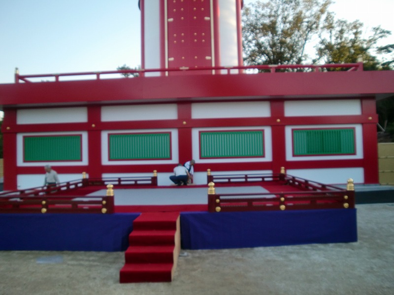 組み立て風景 仏具を配置 お経の練習・・・当日はもう僧侶が増えます 夜露が降りて足下がとても寒い 最初で最後の瑜祇塔脇に於ける式典舞台の様子